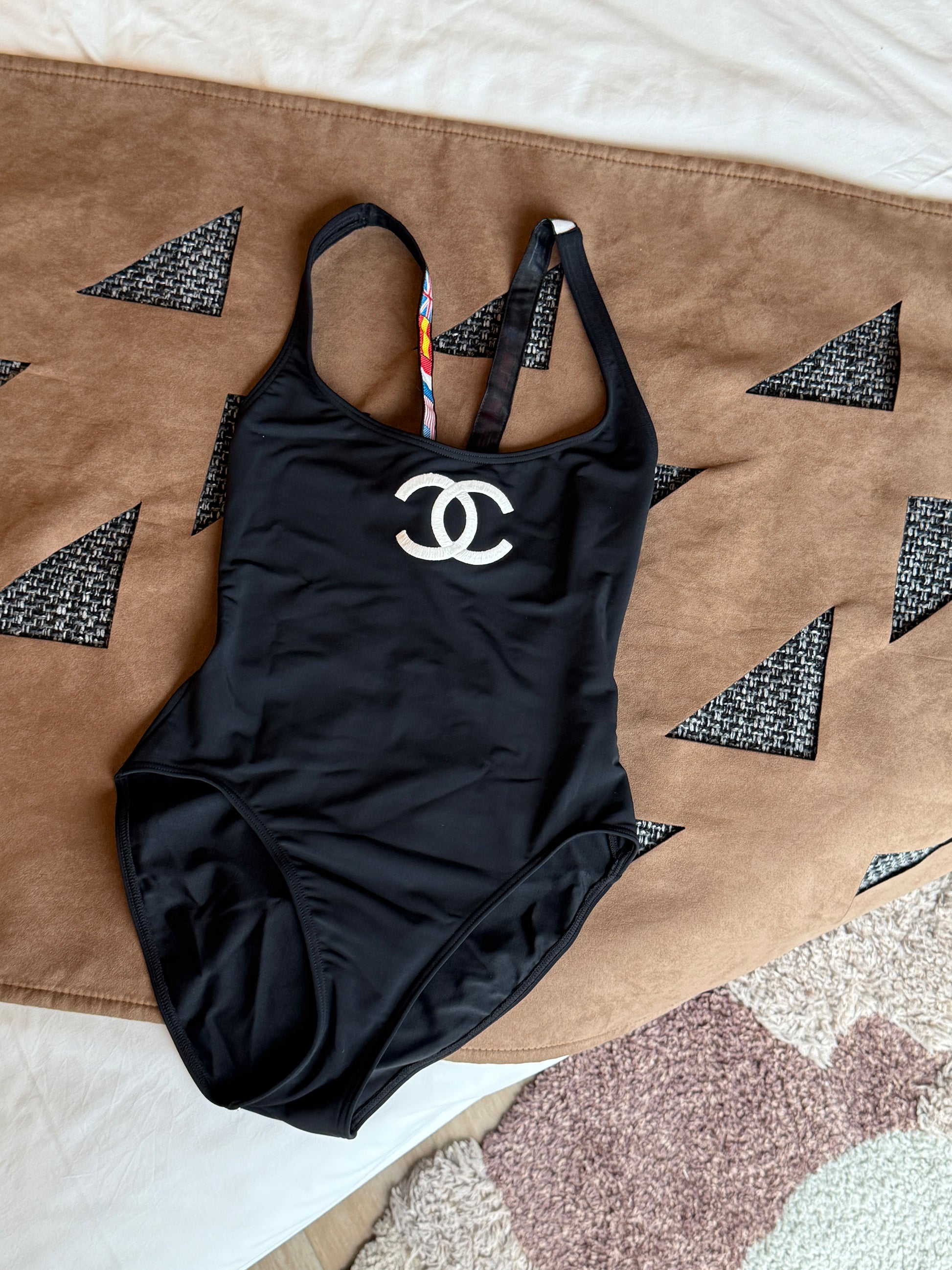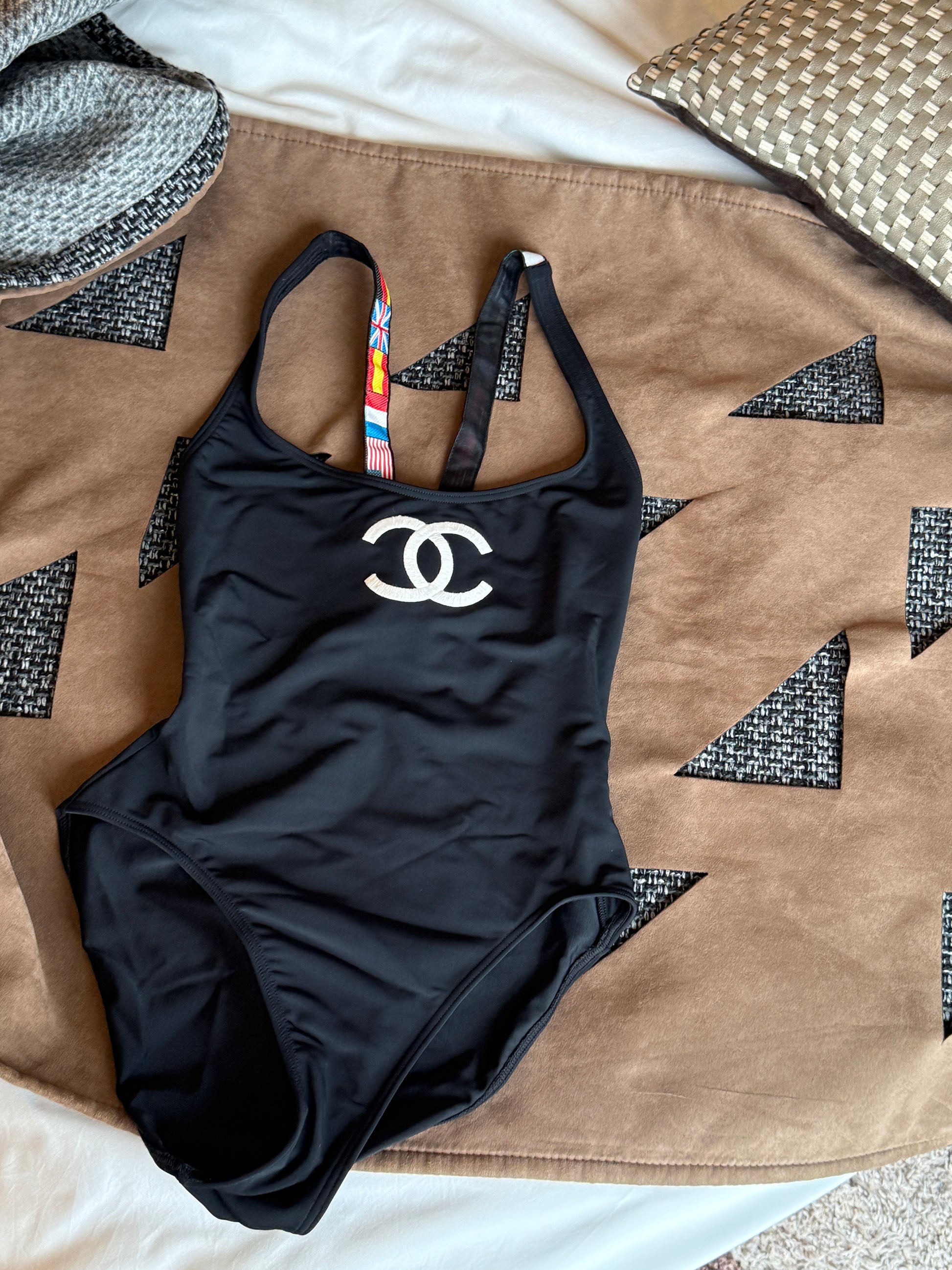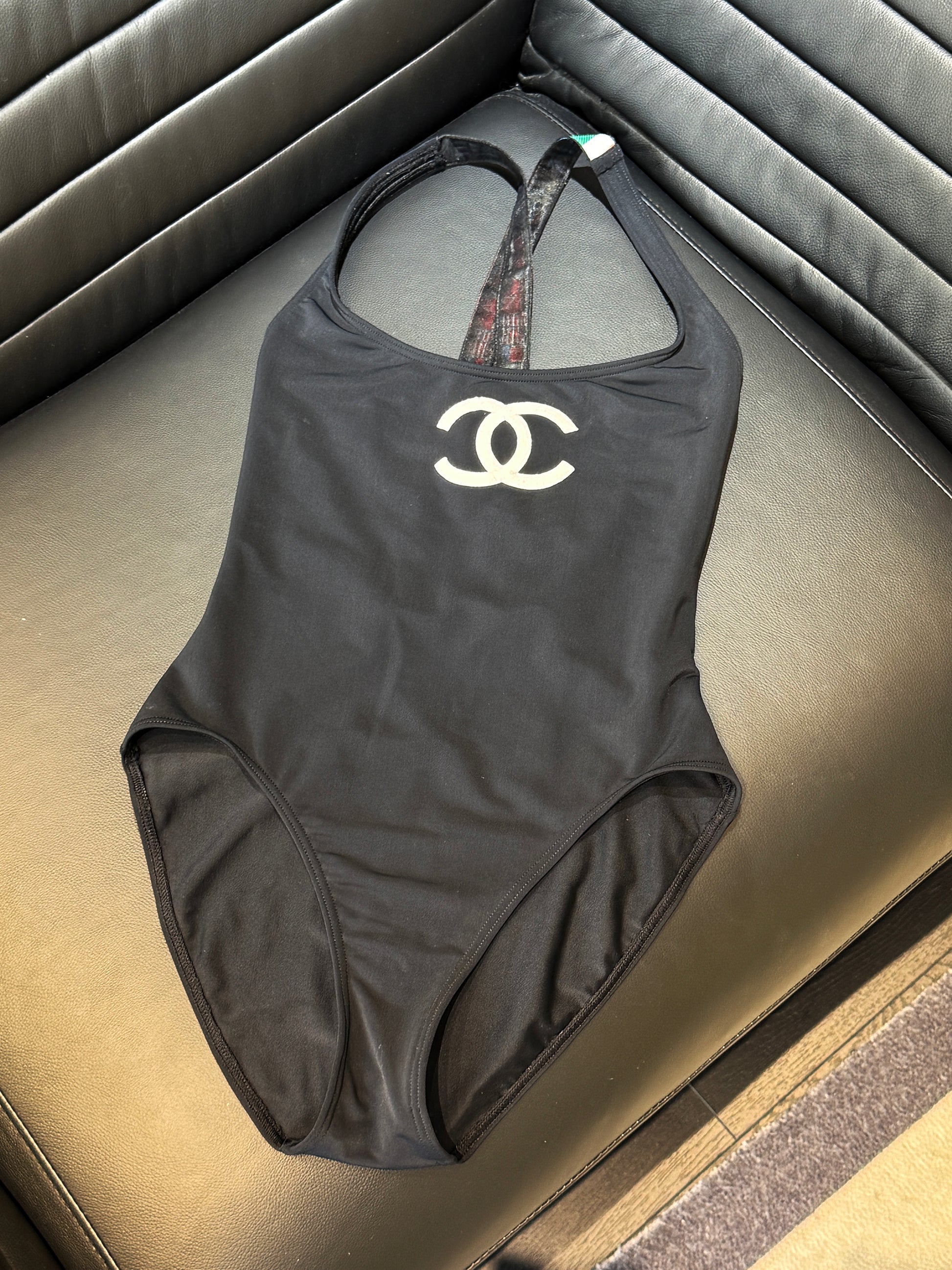 Chanel flag shoulder strap black logo swimsuit Size:36